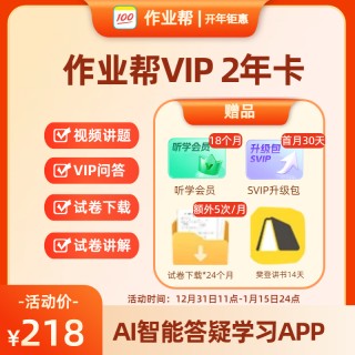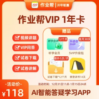 【开年钜惠】🔥🔥作业帮元旦抄底价+福利加赠! 🔸VIP年卡118元🔸VIP2年卡218元🔸VIP3年卡320元 🔹SVIP年卡263元🔹SVIP2年卡489元